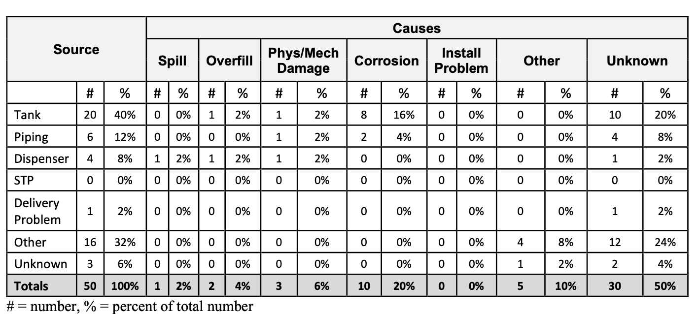 Oregon DEQ reported 50 Underground Storage Tank releases between October 1st 2020 and September 30th 2021 in their annual report. For a sense of scale, 50 leaks means 2.8% of the 1,796 regulated Oregon Underground Storage Tank facilities leaked in one year. And many of the leaks in the DEQ database are not detected until the tank is decommissioned. Also, it is worth understanding from the Oregon DEQ annual report that even if the tank itself is working perfectly USTs can leak from their dispensers, piping, or have spills caused from delivery hardware.