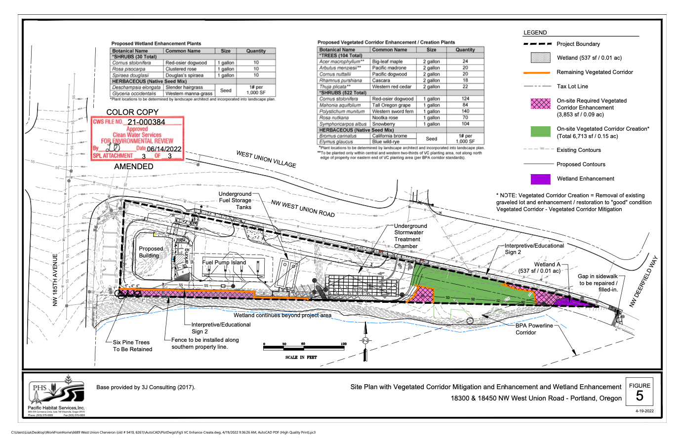 According to the site plans the gas pumps are about 60ft from the Bethany Creek wetland and the Underground Storage Tanks (UST) are about 80ft away. It is not uncommon for USTs to leak. The regulations for USTs are not set by Washington county but instead are regulated by Oregon Department of Environmental Quality (DEQ). Learn more at the DEQ UST program page or lookup UST cleanup sites by zipcode.